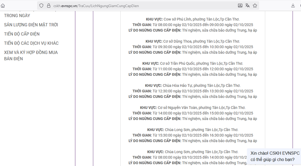 Lịch ngừng cấp điện trên địa bàn Cần Thơ ngày mai 1/10 được cập nhật lúc 9h44 ngày 30/9 tại website của EVNSPC.