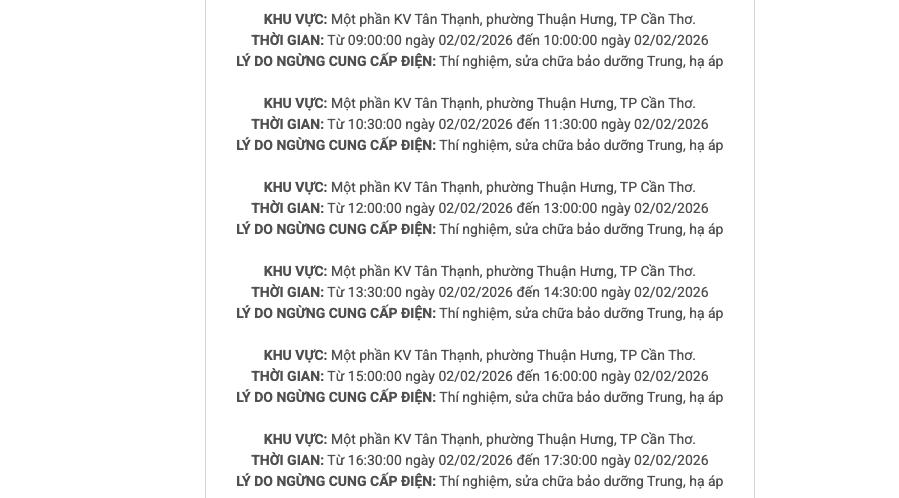 - lịch ngừng cung cấp điện cần thơ ngày 2/2/2026