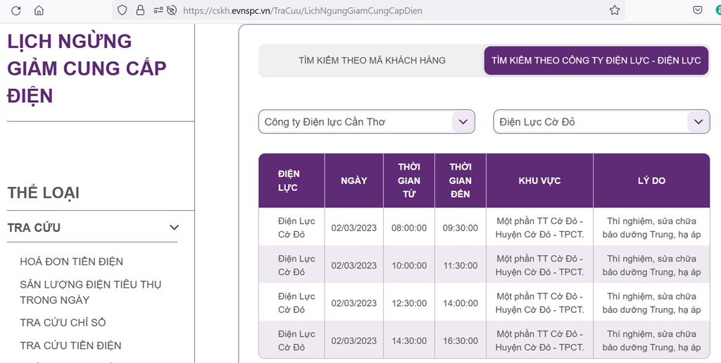 | Điện Lực Cờ Đỏ | 02/03/2023 | 12:30:00 | 14:00:00 | Một phần TT Cờ Đỏ - Huyện Cờ Đỏ - TPCT. | Thí nghiệm, sửa chữa bảo dưỡng Trung, hạ áp |
