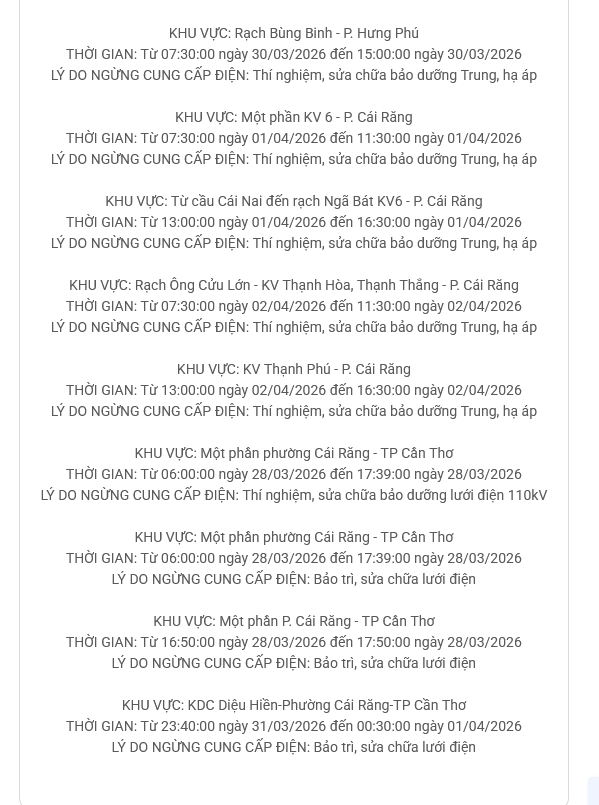 Công ty Điện lực thành phố Cần Thơ thông báo lịch cắt điện ngày mai 2/4 tại các xã, phường trên địa bàn thành phố Cần Thơ trên website của Tổng Công ty Điện lực miền Nam như sau.