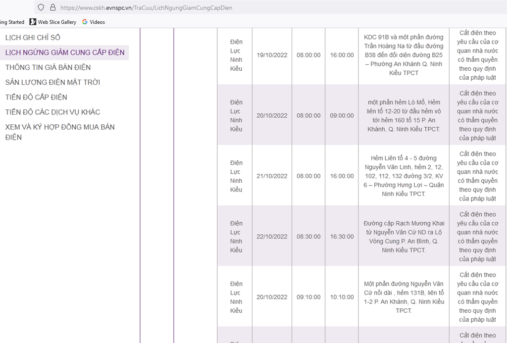 | Điện Lực Ninh Kiều | 20/10/2022 | 13:00:00 | 14:00:00 | Đường Lê Bình P. Hưng Lợi, Q. Ninh Kiều TPCT. | Cắt điện theo yêu cầu của cơ quan nhà nước có thẩm quyền theo quy định của pháp luật |