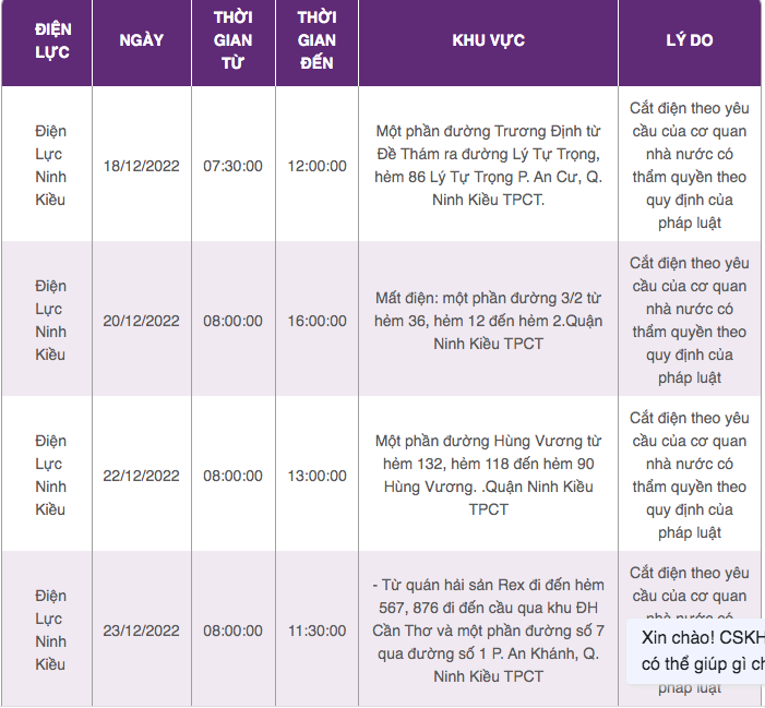 | Điện Lực Ninh Kiều | 20/12/2022 | 8:00:00 | 16:00:00 | Mất điện: một phần đường 3/2 từ hẻm 36, hẻm 12 đến hẻm 2.Quận Ninh Kiều TPCT | Cắt điện theo yêu cầu của cơ quan nhà nước có thẩm quyền theo quy định của pháp luật |