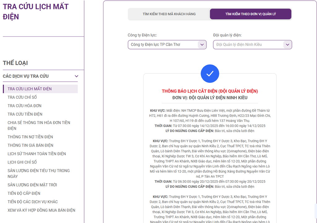 Lịch ngừng cấp điện trên địa bàn Cần Thơ ngày mai 18/12 được cập nhật vào ngày 17/12 tại website của EVNSPC.