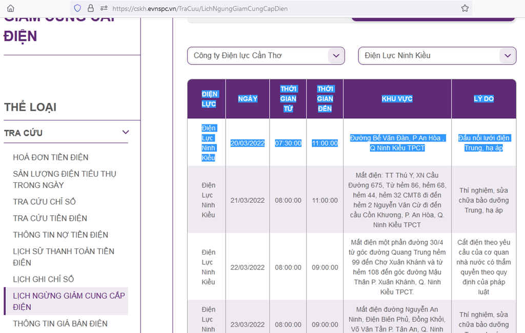 Lịch ngừng cấp điện trên địa bàn Cần Thơ ngày mai 20/3 được cập nhật vào 14h06 ngày 19/3 tại website của EVNSPC. Ảnh: BNEWS