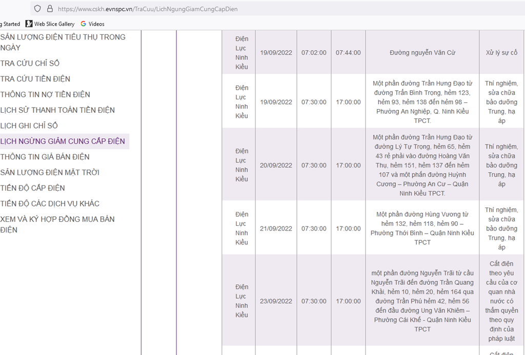 Để cập nhật lịch cắt điện Cần Thơ, người dân có thể truy cập: https://cskh.evnspc.vn/TraCuu/LichNgungGiamCungCapDien