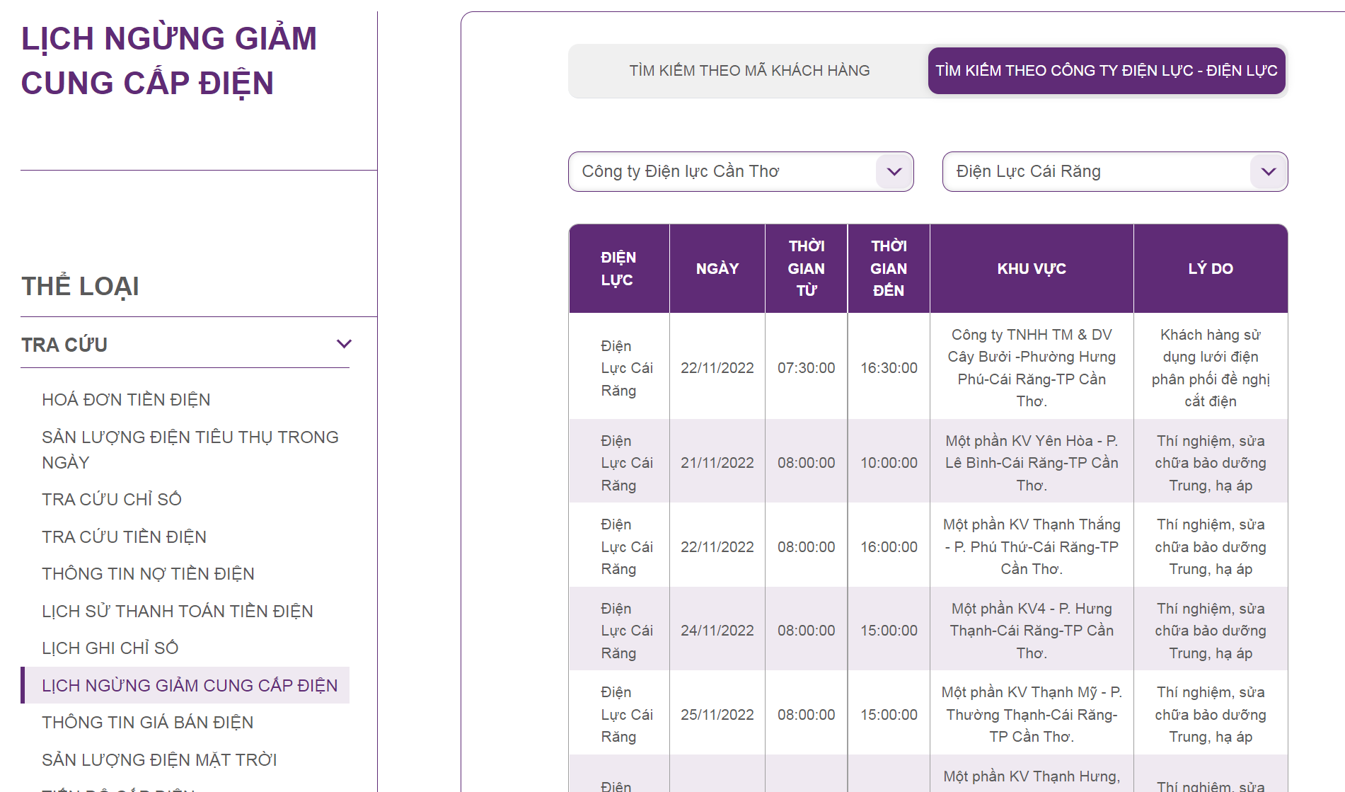 | Điện Lực Thốt Nốt | 21/11/2022 | 11:00 | 12:00 | DNTN Phú Trọng | Thí nghiệm, sửa chữa bảo dưỡng Trung, hạ áp |