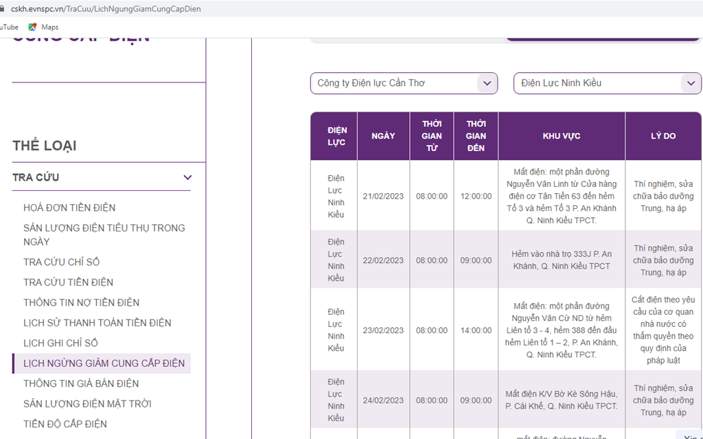 Lịch ngừng cấp điện tại Cần Thơ ngày mai 21/2 được cập nhật ngày 20/2 tại website của EVNSPC. Ảnh: BNEWS