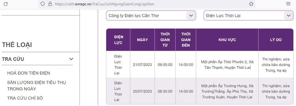 | Điện Lực Thới Lai | 21/07/2023 | 08:00:00 | 14:00:00 | Một phần Ấp Thới Phước 2, Xã Tân Thạnh, Huyện Thới Lai | Thí nghiệm, sửa chữa bảo dưỡng Trung, hạ áp |