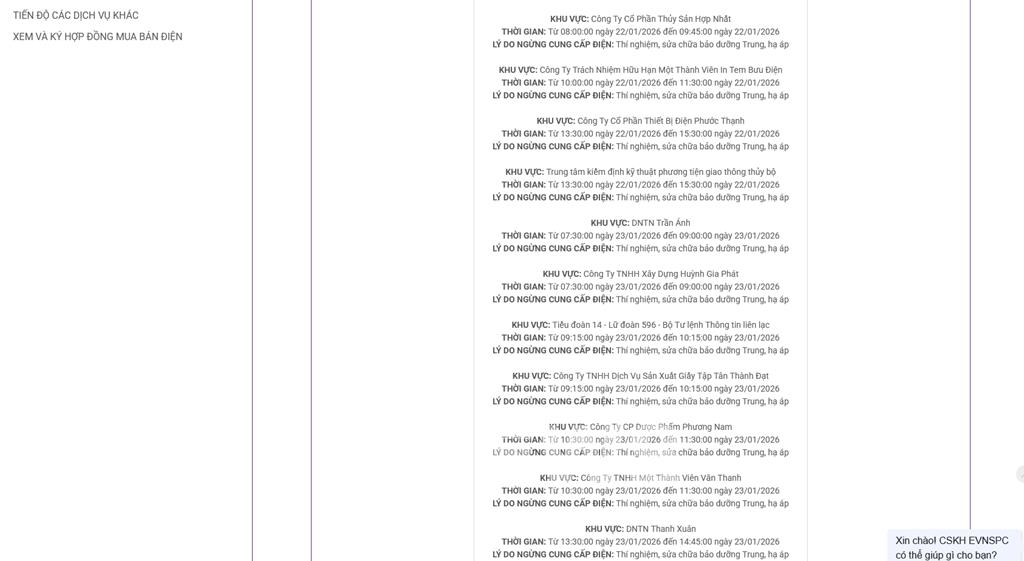 Lịch ngừng cấp điện tại Cần Thơ ngày mai 22/1 được cập nhật ngày 21/1 tại website của EVNSPC. Ảnh: BNEWS phát