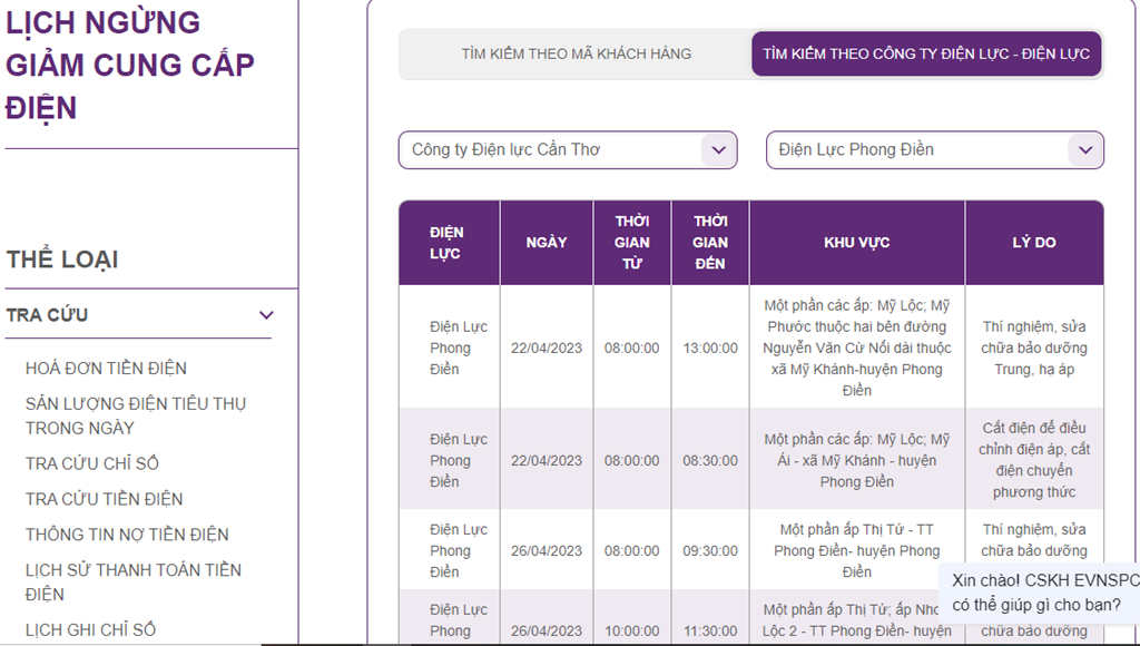 Lịch cắt điện Cần Thơ ngày 22/4 cập nhật tại website của EVNSPC. Ảnh: BNEWS