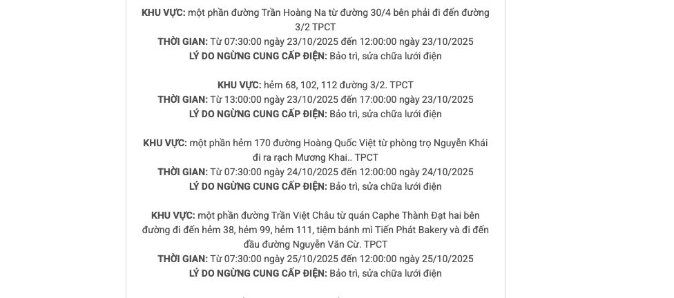 KHU VỰC: một phần đường Trần Hoàng Na từ đường 30/4 bên phải đi đến đường 3/2 TPCT THỜI GIAN: Từ 07:30:00 ngày 23/10/2025 đến 12:00:00 ngày 23/10/2025 LÝ DO NGỪNG CUNG CẤP ĐIỆN: Bảo trì, sửa chữa lưới điện