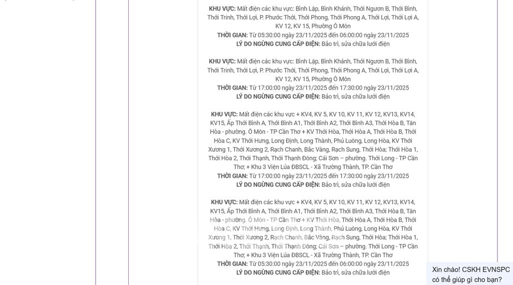 Lịch cắt điện Cần Thơ ngày mai 23/11 cập nhật mới nhất. Nguồn ảnh: PC Cần Thơ