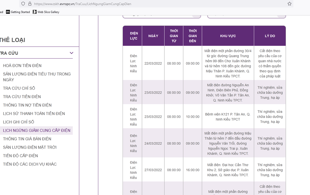 | Điện Lực Ninh Kiều | 23/03/2022 | 09:30:00 | 10:30:00 | Mất điện Điện Biên Phủ, Đồng Khởi, Phan Đình Phùng P. Tân An, Q. Ninh Kiều TPCT | Thí nghiệm, sửa chữa bảo dưỡng Trung, hạ áp |