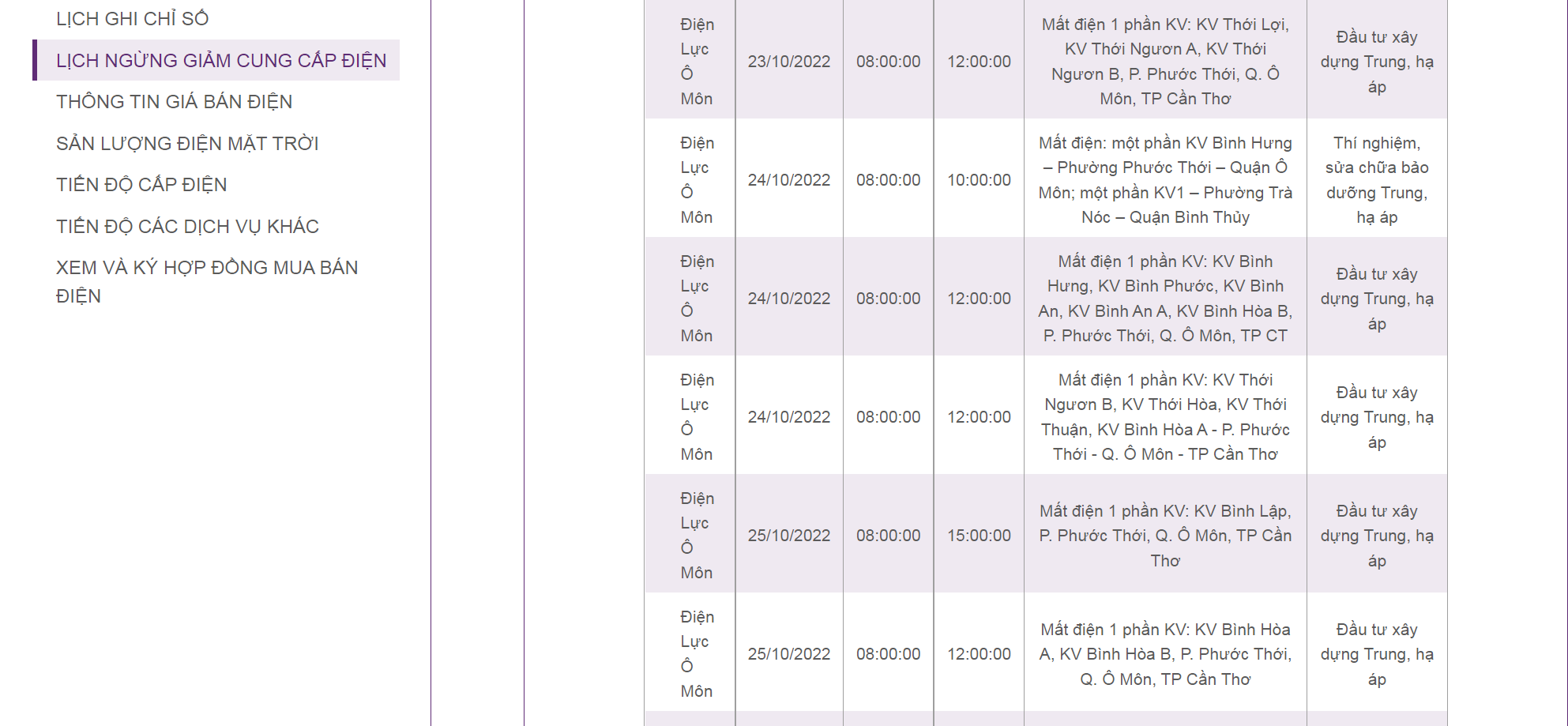 | Điện Lực Ô Môn | 24/10/2022 | 8:00:00 | 12:00:00 | Mất điện 1 phần KV: KV Bình Hưng, KV Bình Phước, KV Bình An, KV Bình An A, KV Bình Hòa B, P. Phước Thới, Q. Ô Môn, TP CT | Đầu tư xây dựng Trung, hạ áp |