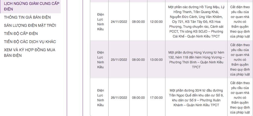 | Điện Lực Ninh Kiều | 24/11/2022 | 8:00:00 | 12:00:00 | Một phần các đường Hồ Tùng Mậu, Lý Hồng Thanh, Trần Quang Khải, Nguyễn Đức Cảnh, Ung Văn Khiêm, Cty 721, KS Tân Tây Đô, KS Hoa Phượng, Trung chuyển rác, Cảnh sát PCCT, Thi công KS SOJO – Phường Cái Khế - Quận Ninh Kiều TPCT | Cắt điện theo yêu cầu của cơ quan nhà nước có thẩm quyền theo quy định của pháp luật |