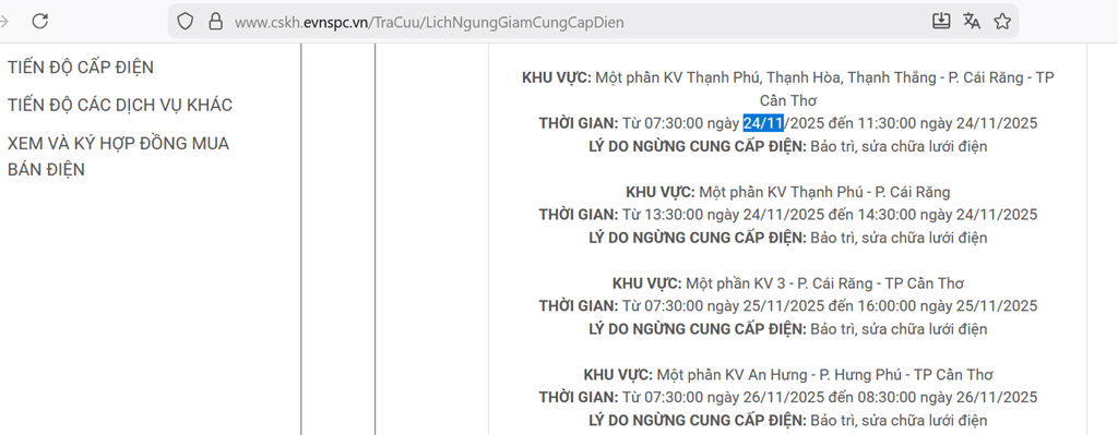 Chi tiết lịch cắt điện ngày mai 24/11 Cần Thơ cụ thể như sau: