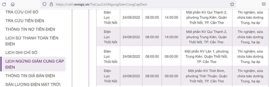 | Điện Lực Thốt Nốt | 24/08/2022 | 08:00:00 | 14:00:00 | Một phần KV Qui Thạnh 2, phường Trung Kiên, Quận Thốt Nốt, TP. Cần Thơ. | Thí nghiệm, sửa chữa bảo dưỡng Trung, hạ áp |