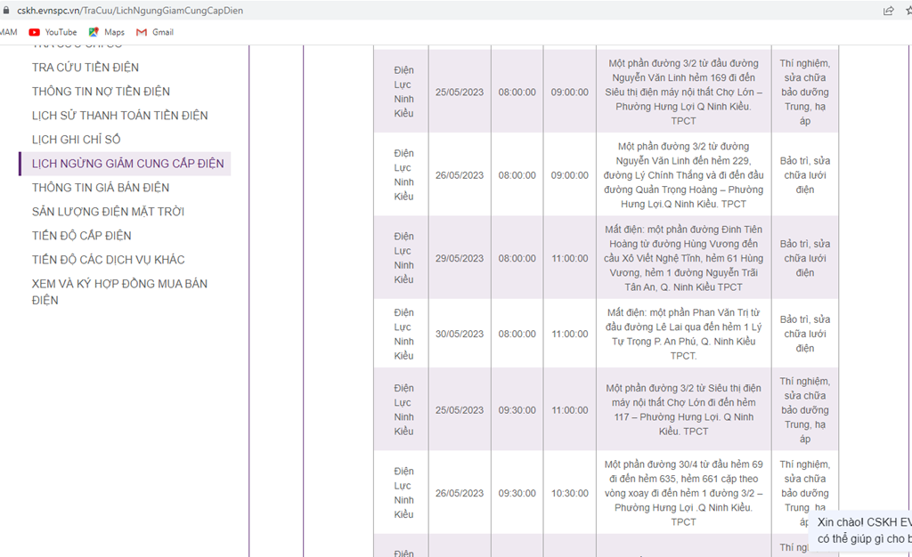 | Điện Lực Ninh Kiều | 25/05/2023 | 8:00:00 | 9:00:00 | Một phần đường 3/2 từ đầu đường Nguyễn Văn Linh hẻm 169 đi đến Siêu thị điện máy nội thất Chợ Lớn – Phường Hưng Lợi Q Ninh Kiều. TPCT | Thí nghiệm, sửa chữa bảo dưỡng Trung, hạ áp |