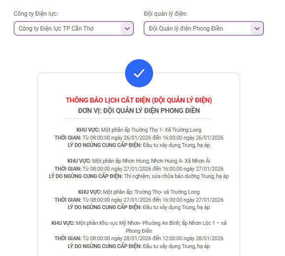 Công ty Điện lực thành phố Cần Thơ thông báo lịch cắt điện ngày mai 26/1 tại các xã, phường Cần Thơ như sau: