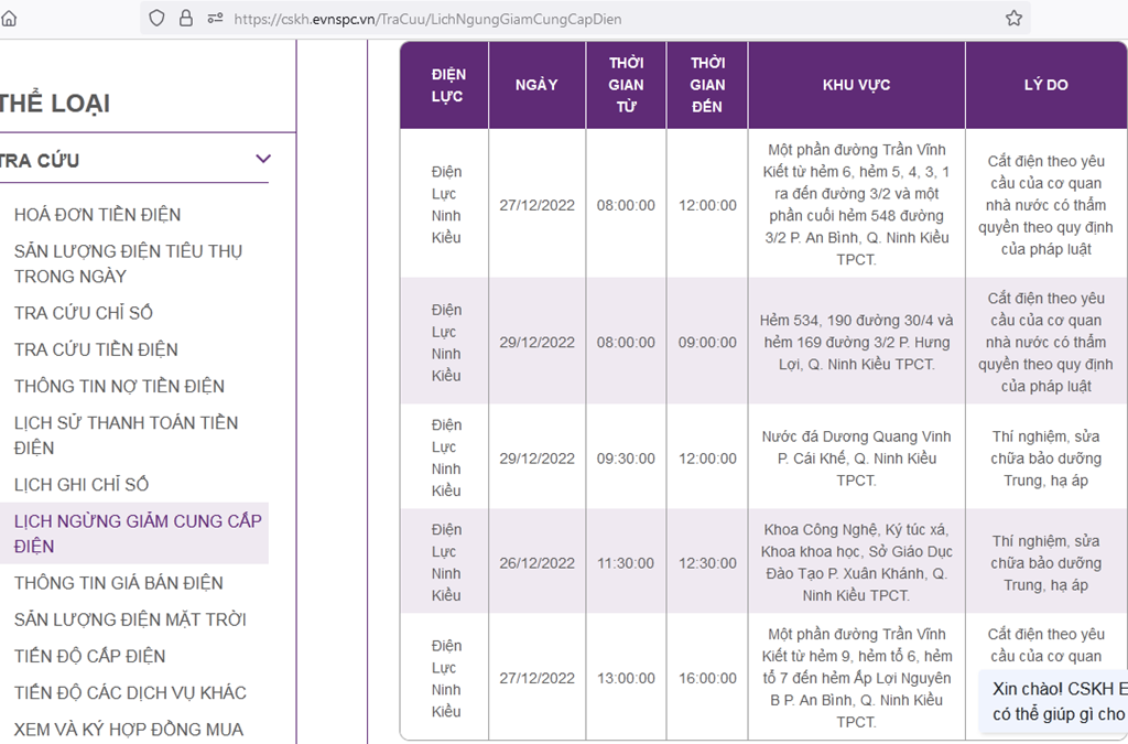 Lịch ngừng cấp điện tại Cần Thơ ngày mai 26/12 được cập nhật ngày 25/12 tại website của EVNSPC. Ảnh: BNEWS