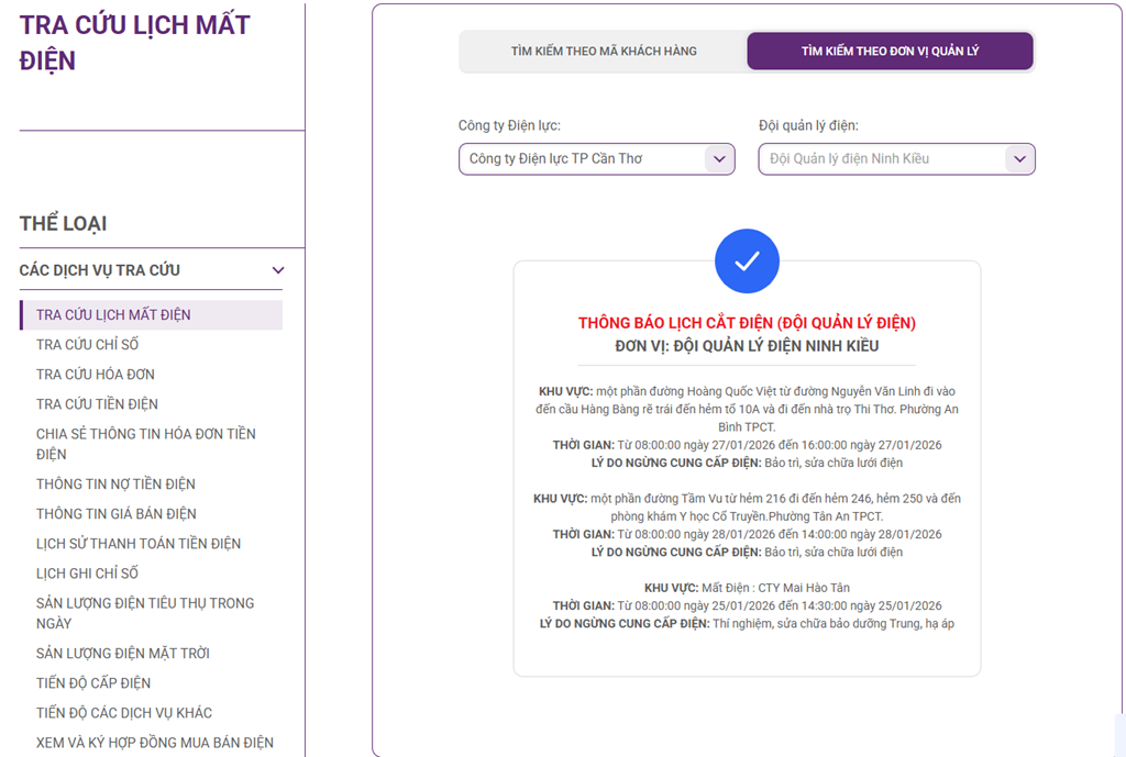 Lịch cắt điện tại các xã, phường trên địa bàn Cần Thơ ngày mai 26/1 được cập nhật tại website của Tổng công ty Điện lực miền Nam (EVNSPC).