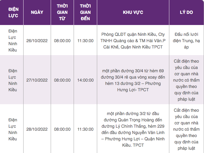 | Điện Lực Ninh Kiều | 27/10/2022 | 8:00:00 | 14:00:00 | một phần đường 30/4 từ hẻm 69 đường 30/4 rẽ qua vòng xoay đến hẻm 13 đường 3/2 – Phường Hưng Lợi- TPCT | Cắt điện theo yêu cầu của cơ quan nhà nước có thẩm quyền theo quy định của pháp luật |