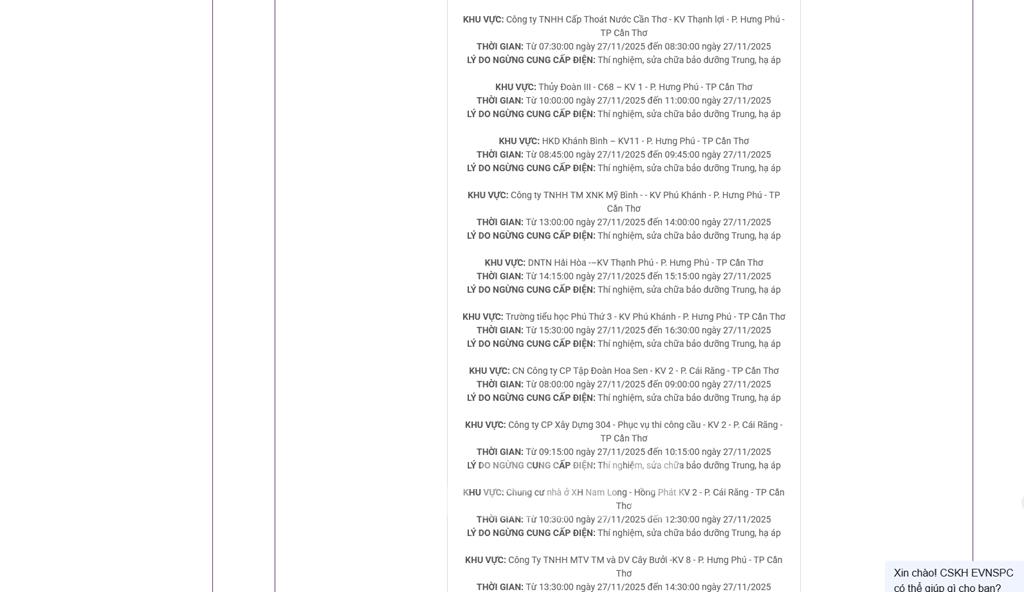 Lịch cắt điện Cần Thơ ngày mai 27/11 cập nhật mới nhất. Nguồn ảnh: PC Cần Thơ