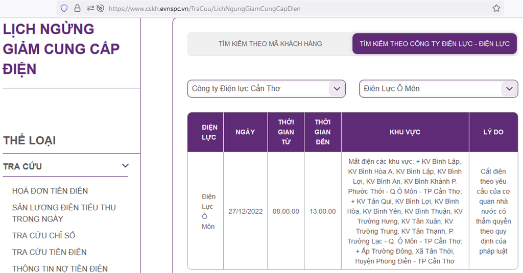 | Điện Lực Thốt Nốt | 27/12/2022 | 8:00:00 | 16:00:00 | Một phần phường Tân Lộc., quận Thốt Nốt, TP. Cần Thơ. | Cắt điện theo yêu cầu của cơ quan nhà nước có thẩm quyền theo quy định của pháp luật |