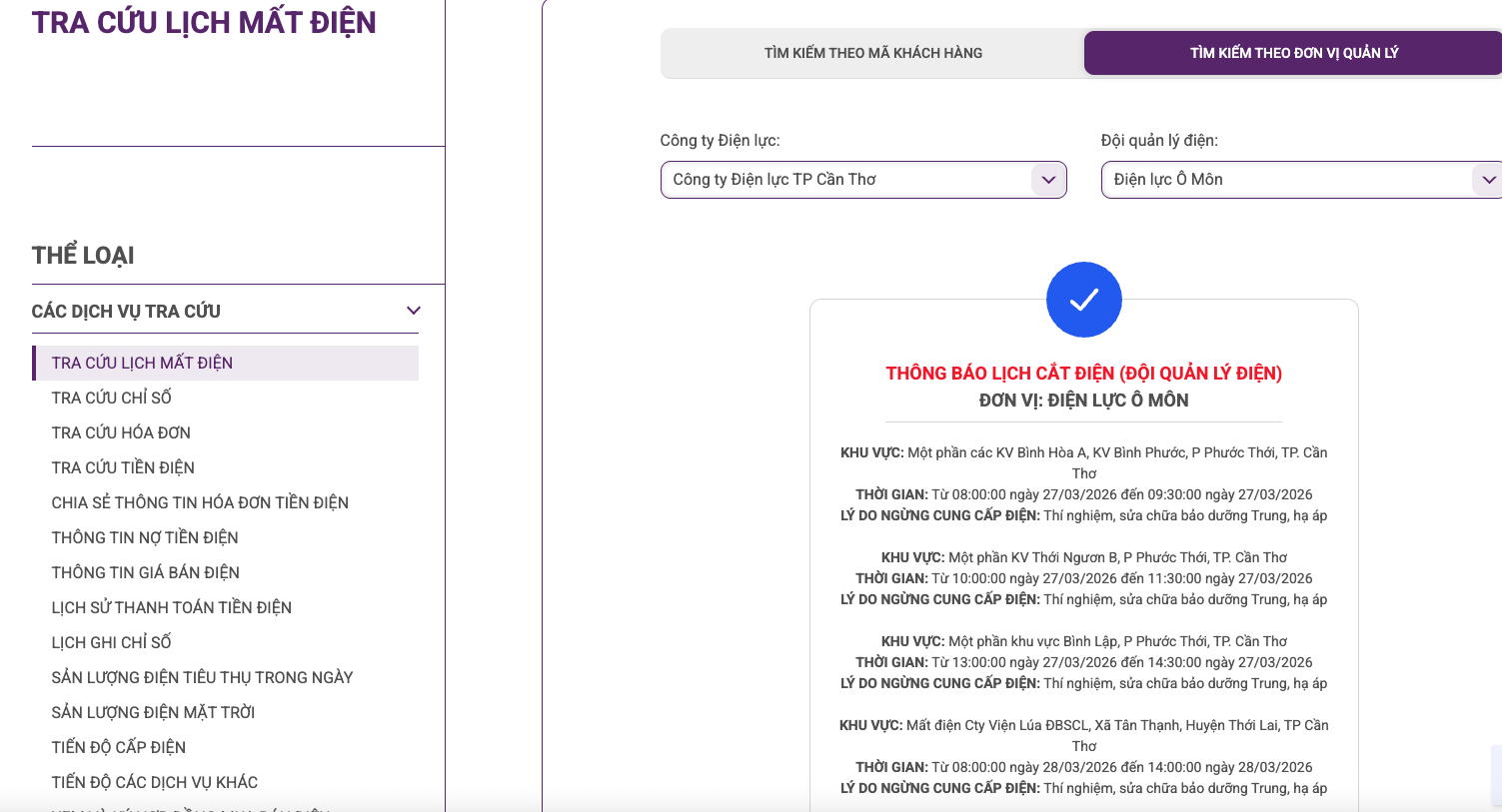 Lịch ngừng cấp điện tại Cần Thơ ngày mai 27/3 được cập nhật ngày 26/3 tại website của EVNSPC. Ảnh: BNEWS phát