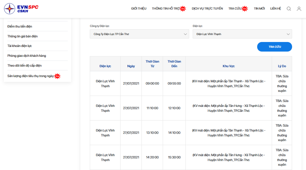 Lịch cắt điện Cần Thơ ngày 27/7 cập nhật lúc 11h15 ngày 26/7 tại website của EVNSPC. Ảnh: BNEWS
