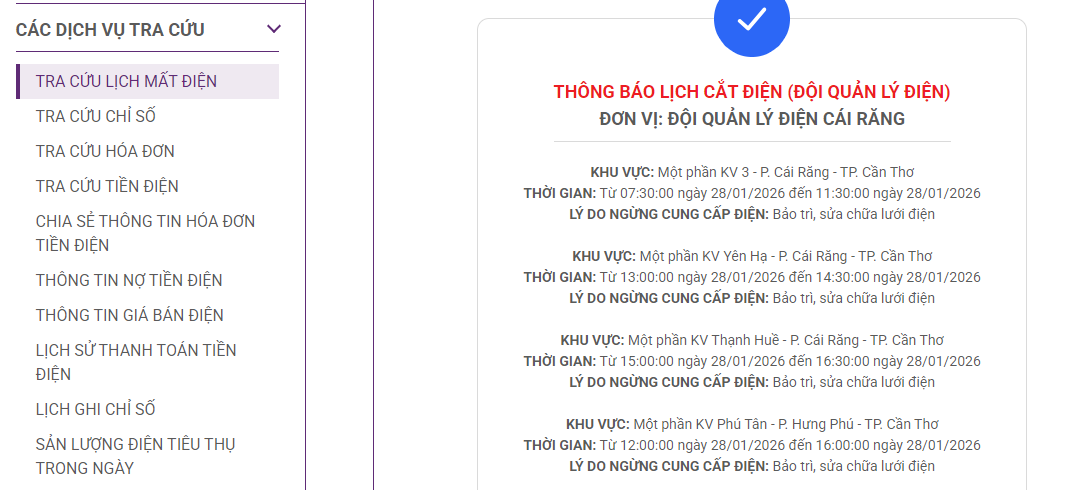 THỜI GIAN: Từ 08:00:00 ngày 28/01/2026 đến 14:00:00 ngày 28/01/2026LÝ DO NGỪNG CUNG CẤP ĐIỆN: Bảo trì, sửa chữa lưới điệnKHU VỰC: Một phần KV 3 - P. Cái Răng - TP. Cần Thơ