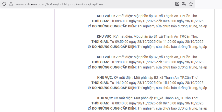 Chi tiết lịch ngừng cấp điện tại Cần Thơ ngày mai 28/10 cụ thể như sau: