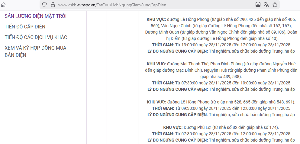 Lịch ngừng cấp điện tại Cần Thơ ngày mai 28/11 được cập nhật ngày 27/11 tại website của EVNSPC. Ảnh: BNEWS phát