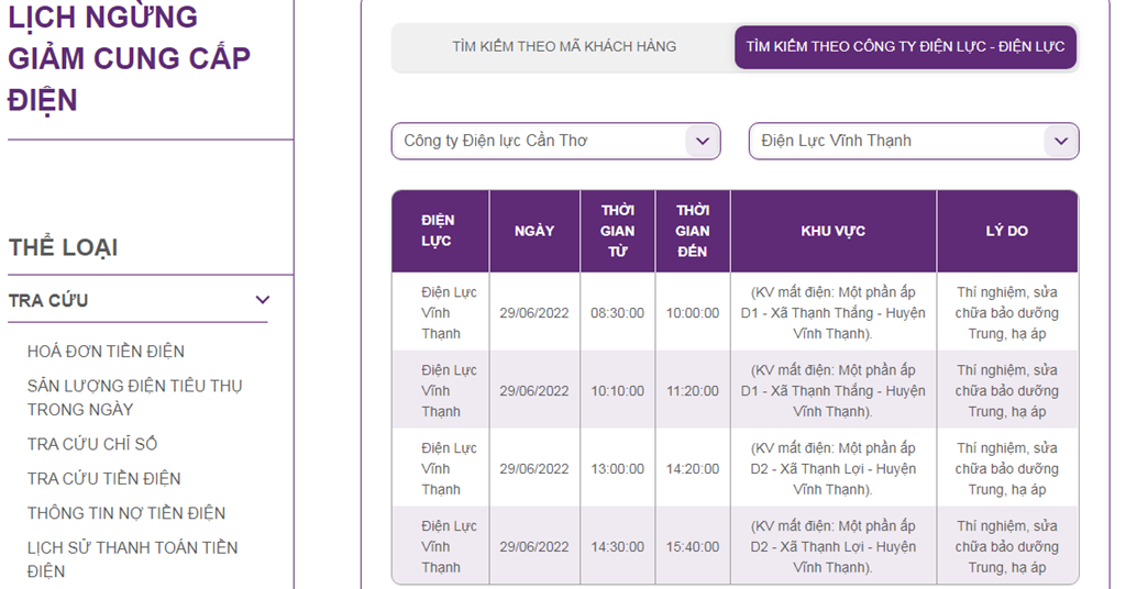| Điện Lực Thốt Nốt | 29/06/2022 | 09:30:00 | 10:30:00 | Một phần Qui Thạnh 1, phường Trung Kiên - Quận Thốt Nốt - TP. Cần Thơ. | Thí nghiệm, sửa chữa bảo dưỡng Trung, hạ áp |