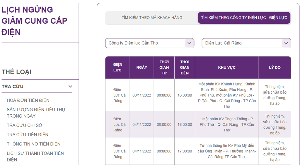 | Điện Lực Cái Răng | 03/11/2022 | 08:00:00 | 16:30:00 | Một phần KV Khánh Hưng, Khánh Bình, Phú Xuân, Phú Hưng - P. Phú Thứ, một phần KV Phú Lợi - P. Tân Phú - Q. Cái Răng - TP Cần Thơ | Thí nghiệm, sửa chữa bảo dưỡng Trung, hạ áp |