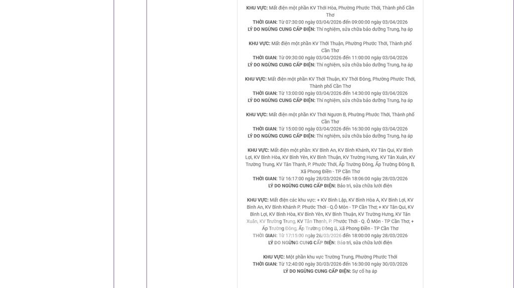 THỜI GIAN: Từ 07:30:00 ngày 03/04/2026 đến 09:00:00 ngày 03/04/2026LÝ DO NGỪNG CUNG CẤP ĐIỆN: Thí nghiệm, sửa chữa bảo dưỡng Trung, hạ ápKHU VỰC: Mất điện một phần KV Thới Thuận, Phường Phước Thới, Thành phố Cần ThơTHỜI GIAN: Từ 09:30:00 ngày 03/04/2026 đến 11:00:00 ngày 03/04/2026LÝ DO NGỪNG CUNG CẤP ĐIỆN: Thí nghiệm, sửa chữa bảo dưỡng Trung, hạ ápKHU VỰC: Mất điện một phần KV Thới Thuận, KV Thới Đông, Phường Phước Thới, Thành phố Cần ThơTHỜI GIAN: Từ 13:00:00 ngày 03/04/2026 đến 14:30:00 ngày 03/04/2026LÝ DO NGỪNG CUNG CẤP ĐIỆN: Thí nghiệm, sửa chữa bảo dưỡng Trung, hạ ápKHU VỰC: Mất điện một phần KV Thới Ngươn B, Phường Phước Thới, Thành phố Cần ThơTHỜI GIAN: Từ 15:00:00 ngày 03/04/2026 đến 16:30:00 ngày 03/04/2026LÝ DO NGỪNG CUNG CẤP ĐIỆN: Thí nghiệm, sửa chữa bảo dưỡng Trung, hạ áp KHU VỰC: Một phần KV Qui Thạnh 1, Phụng Thạnh 1, Phụng Thạnh 2, phường Thuận Hưng, Tp. Cần Thơ.THỜI GIAN: Từ 07:30:00 ngày 03/04/2026 đến 14:00:00 ngày 03/04/2026LÝ DO NGỪNG CUNG CẤP ĐIỆN: Bảo trì, sửa chữa lưới điệnKHU VỰC: Một phần KV Phụng Thạnh 1, phường Thuận Hưng, Tp. Cần Thơ.THỜI GIAN: Từ 07:30:00 ngày 03/04/2026 đến 14:00:00 ngày 03/04/2026LÝ DO NGỪNG CUNG CẤP ĐIỆN: Bảo trì, sửa chữa lưới điện KHU VỰC: Ấp Thới Quan A, Xã Thới LaiTHỜI GIAN: Từ 08:00:00 ngày 03/04/2026 đến 10:00:00 ngày 03/04/2026LÝ DO NGỪNG CUNG CẤP ĐIỆN: Thí nghiệm, sửa chữa bảo dưỡng Trung, hạ ápKHU VỰC: Ấp Thới Quan A, Xã Thới LaiTHỜI GIAN: Từ 10:15:00 ngày 03/04/2026 đến 11:30:00 ngày 03/04/2026LÝ DO NGỪNG CUNG CẤP ĐIỆN: Thí nghiệm, sửa chữa bảo dưỡng Trung, hạ áp.EVNSPC khuyến cáo người dân sử dụng các thiết bị điện đúng cách, tiết kiệm, hiệu quả để giảm tiêu thụ điện, góp phần giảm chi phí tiền điện sử dụng trong sinh hoạt cuộc sống thường ngày.