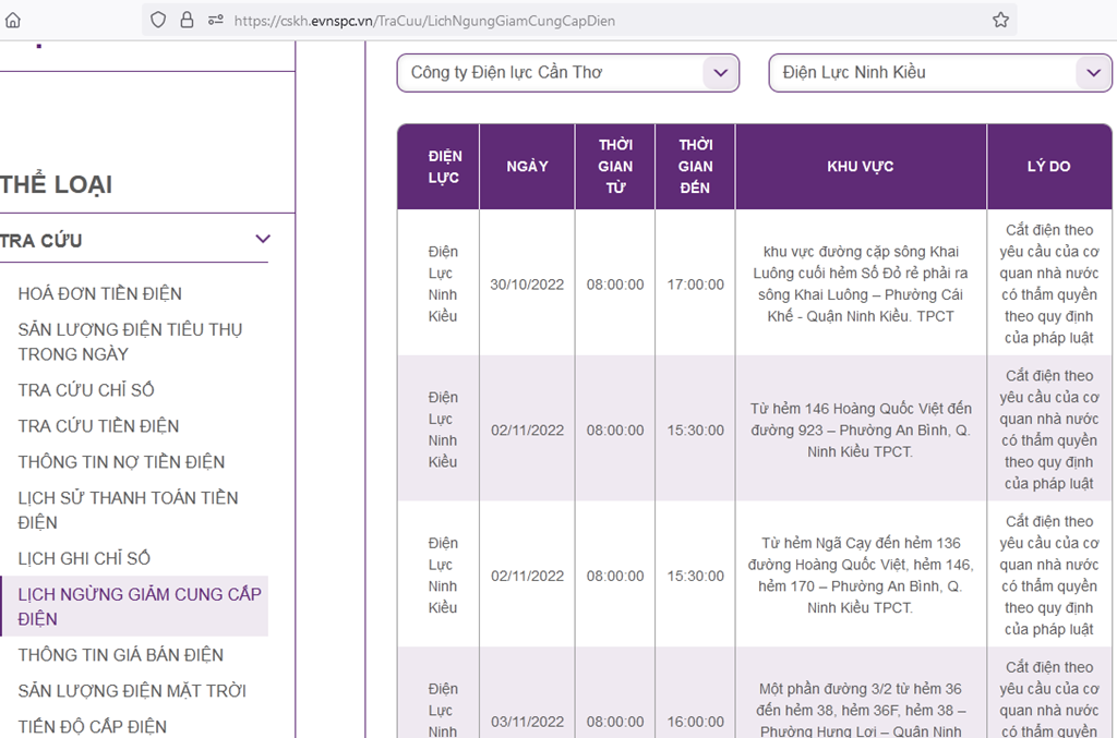 Để cập nhật lịch cắt điện Cần Thơ, người dân có thể truy cập: https://cskh.evnspc.vn/TraCuu/LichNgungGiamCungCapDien