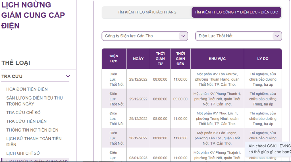 Lịch ngừng cấp điện trên địa bàn Cần Thơ ngày mai 29/12 được cập nhật lúc 7h35 ngày 28/12 tại website của EVNSPC.