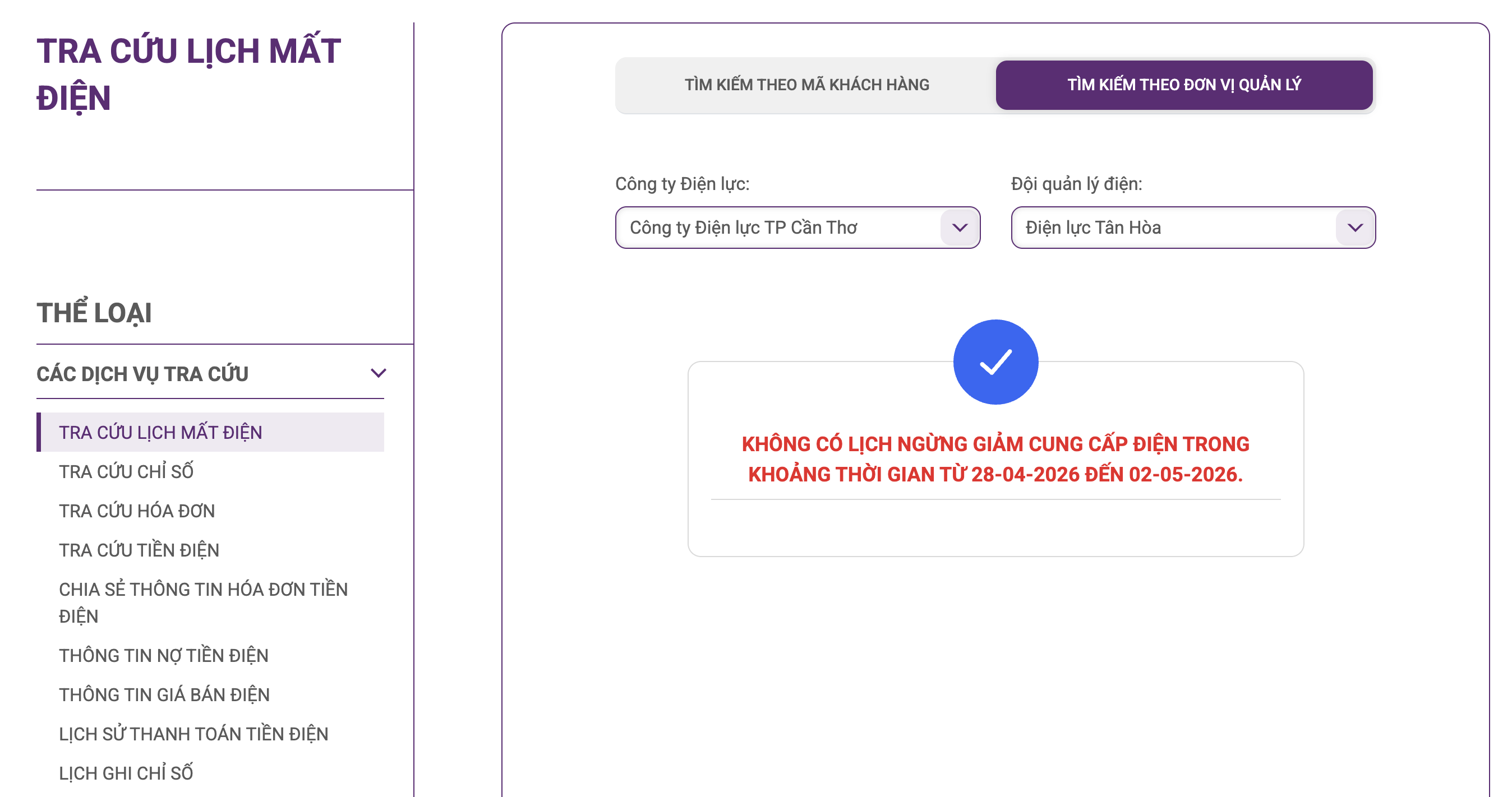 30 ngừng cấp điện tại Cần Thơ ngày mai 29/4 được cập nhật ngày 29/4 tại website của EVNSPC. Ảnh: BNEWS phát