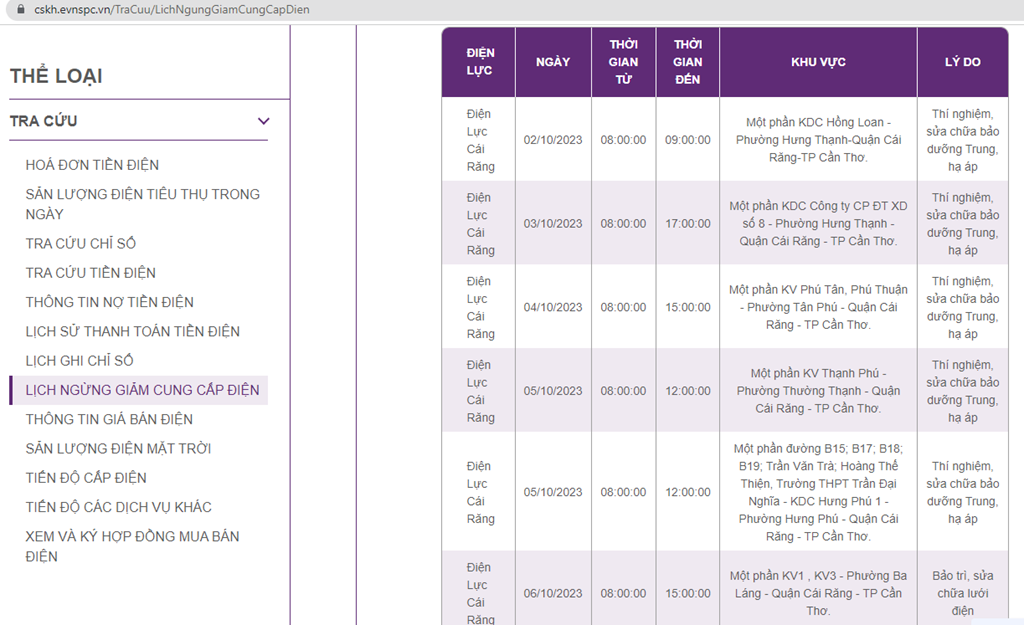 | Điện Lực Cái Răng | 02/10/2023 | 08:00:00 | 09:00:00 | Một phần KDC Hồng Loan - Phường Hưng Thạnh-Quận Cái Răng-TP Cần Thơ. | Thí nghiệm, sửa chữa bảo dưỡng Trung, hạ áp |