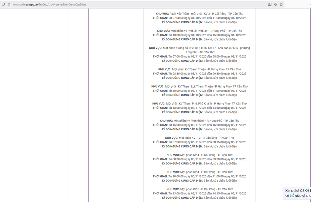 Công ty Điện lực thành phố Cần Thơ thông báo lịch cắt điện ngày mai 31/10 tại các xã, phường trên địa bàn thành phố Cần Thơ trên website của Tổng Công ty Điện lực miền Nam như sau.