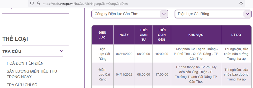 Lịch ngừng cấp điện trên địa bàn Cần Thơ ngày mai 3/11 được cập nhật tại website của EVNSPC.