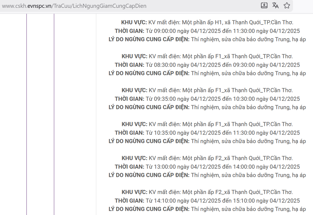 Chi tiết lịch cắt điện ngày mai 4/12 Cần Thơ cụ thể như sau: