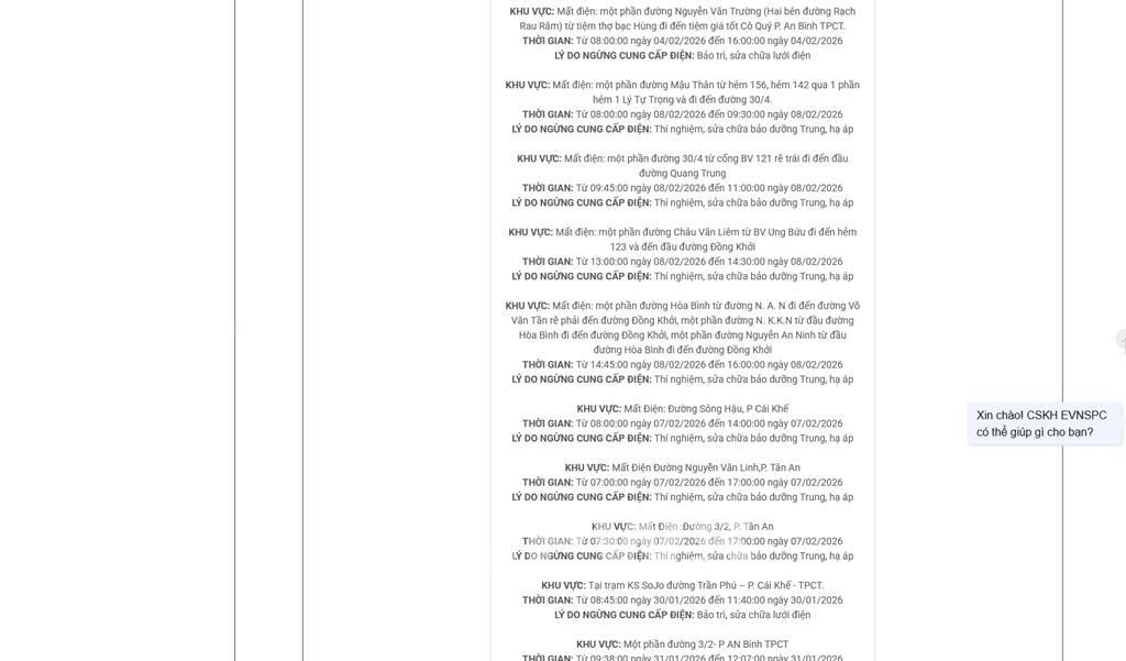Lịch ngừng cấp điện tại Cần Thơ ngày mai 4/2 được cập nhật ngày 3/2 tại website của EVNSPC. Ảnh: BNEWS phát