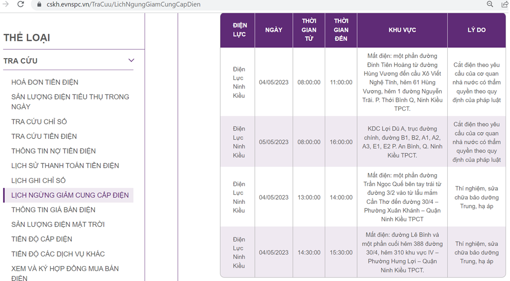 | Điện Lực Ninh Kiều | 04/05/2023 | 14:30:00 | 15:30:00 | Mất điện: đường Lê Bình và một phần cuối hẻm 388 đường 30/4, hẻm 310 khu vực IV – Phường Hưng Lợi – Quận Ninh Kiều TPCT. | Thí nghiệm, sửa chữa bảo dưỡng Trung, hạ áp |