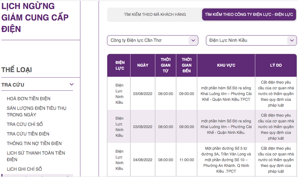 | Điện Lực Ninh Kiều | 04/08/2022 | 08:00:00 | 11:00:00 | Một phần đường Số 5 từ đường 3A, Trần Văn Long và một phần đường Số 10 – Phường An Khánh. Q Ninh Kiều .TPCT | Cắt điện theo yêu cầu của cơ quan nhà nước có thẩm quyền theo quy định của pháp luật |