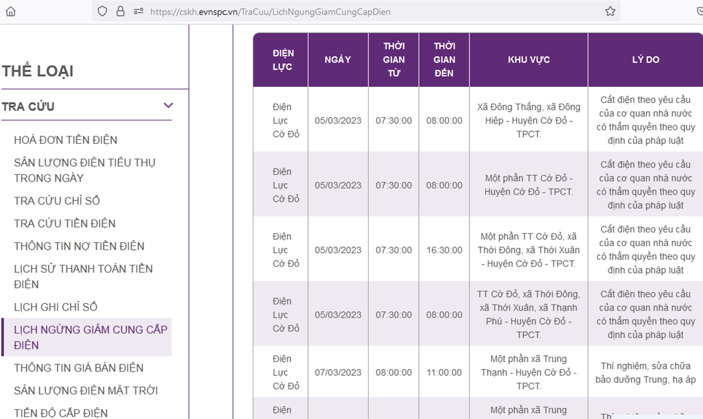 | Điện Lực Cờ Đỏ | 05/03/2023 | 07:30:00 | 16:30:00 | Một phần TT Cờ Đỏ, xã Thới Đông, xã Thới Xuân - Huyện Cờ Đỏ - TPCT. | Cắt điện theo yêu cầu của cơ quan nhà nước có thẩm quyền theo quy định của pháp luật |