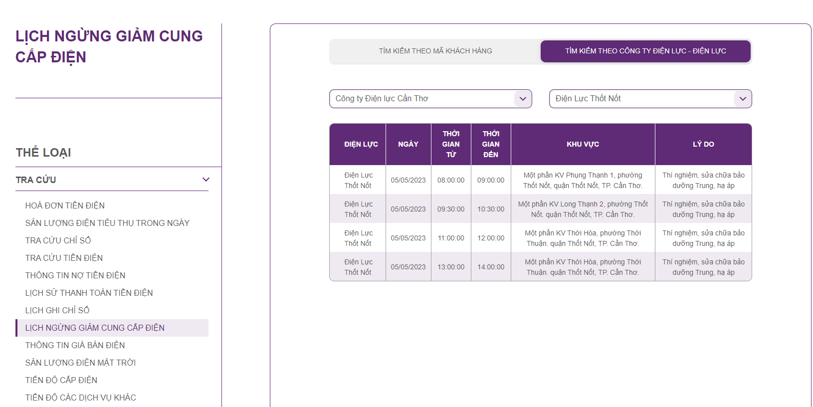 | Điện Lực Thốt Nốt | 05/05/2023 | 13:00:00 | 14:00:00 | Một phần KV Thới Hòa, phường Thới Thuận. quận Thốt Nốt, TP. Cần Thơ. | Thí nghiệm, sửa chữa bảo dưỡng Trung, hạ áp |