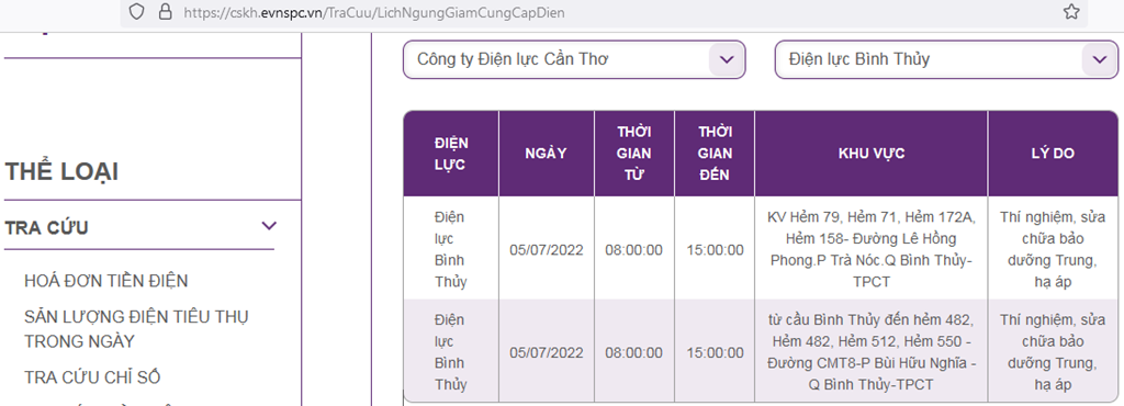 | Điện lực Bình Thủy | 05/07/2022 | 08:00:00 | 15:00:00 | từ cầu Bình Thủy đến hẻm 482, Hẻm 482, Hẻm 512, Hẻm 550 - Đường CMT8-P Bùi Hữu Nghĩa - Q Bình Thủy-TPCT | Thí nghiệm, sửa chữa bảo dưỡng Trung, hạ áp |