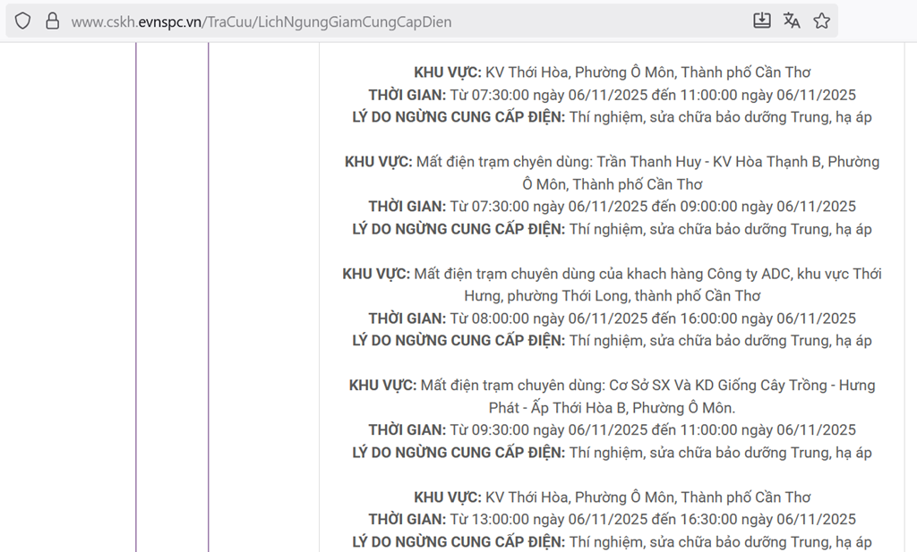 Công ty Điện lực thành phố Cần Thơ thông báo lịch cắt điện ngày mai 6/11 tại các xã, phường trên địa bàn thành phố Cần Thơ trên website của Tổng Công ty Điện lực miền Nam như sau.